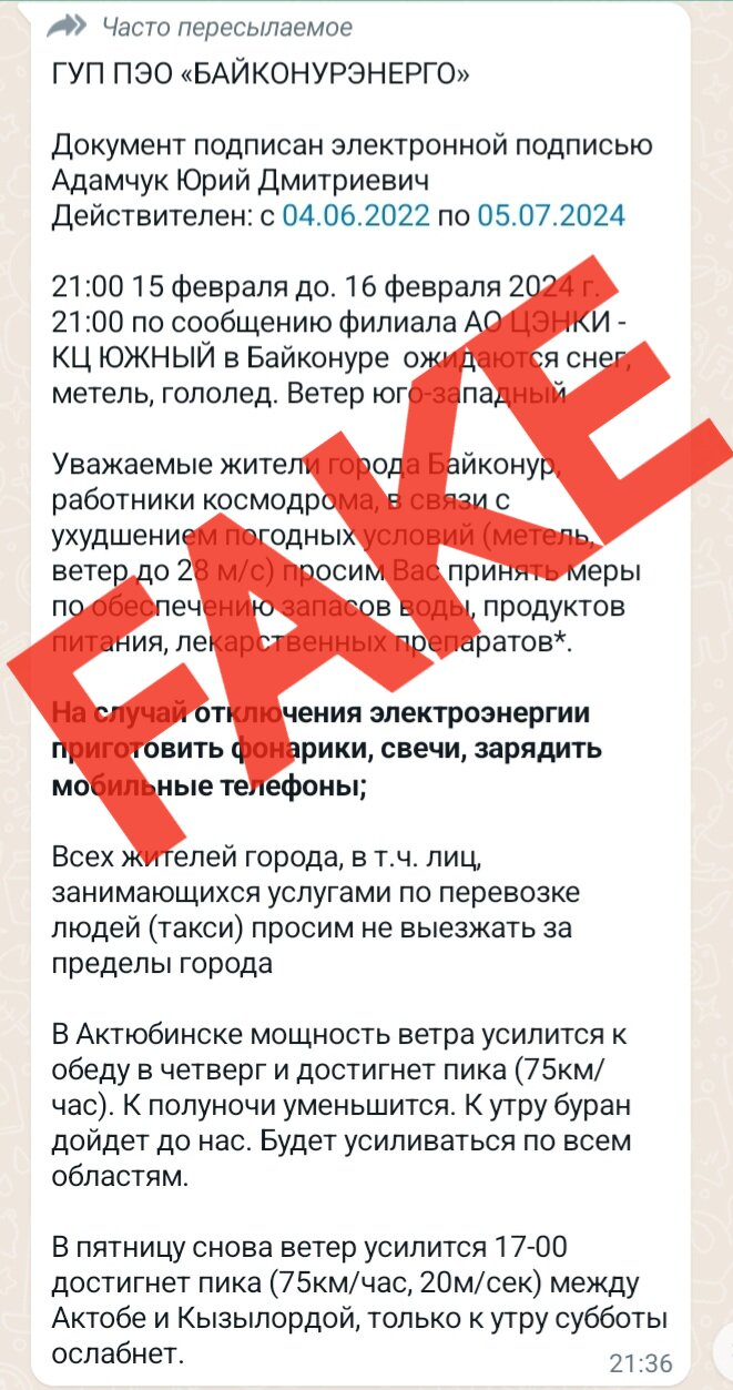ГУП ПЭО «БАЙКОНУРЭНЕРГО» Документ подписан электронной подписью Адамчук Юрий Дмитриевич Действителен: с 04.06.2022 по 05.07.2024 21:00 15 февраля до 16 февраля 2024 г. 21:00 по сообщению филиала АО ЦЭНКИ - КЦ ЮЖНЫЙ в Байконуре ожидаются снег, метель, гололед. Ветер юго-западный. Уважаемые жители города Байконур, работники космодрома, в связи с ухудшением погодных условий (метель, ветер до 28 м/с) просим Вас принять меры по обеспечению запасов воды, продуктов питания, лекарственных препаратов*. *На случай отключения электроэнергии приготовить фонарики, свечи, зарядить мобильные телефоны.* Всех жителей города, в т.ч. лиц, занимающихся услугами по перевозке людей (такси) просим не выезжать за пределы города В Актюбинске мощность ветра усилится к обеду в четверг и достигнет пика (75км/час). К полуночи уменьшится. К утру буран дойдет до нас. Будет усиливаться по всем областям. В пятницу снова ветер усилится 17-00 достигнет пика (75км/час, 20м/сек) между Актобе и Кызылордой, только к утру субботы ослабнет.